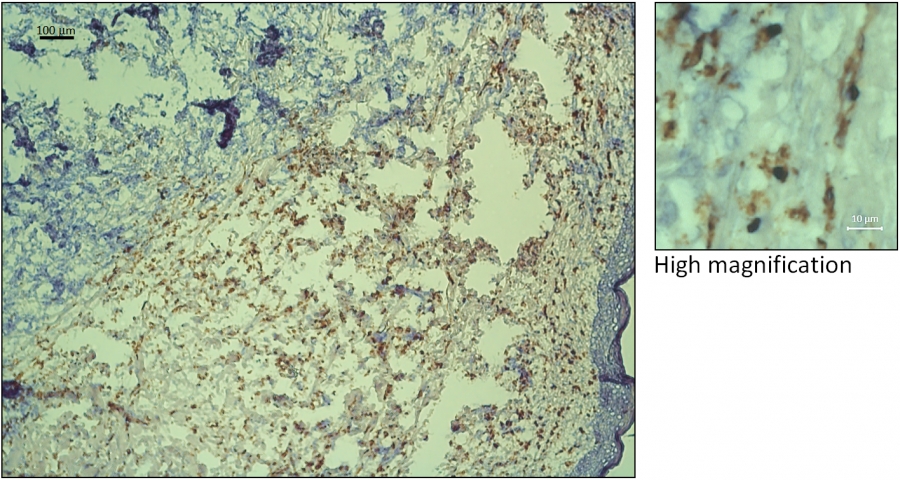 Immunohistochemical staining of human CD206 (brown) with nuclear counterstain (Hematoxilin, in dark blue). Authors: Anni Lepland and Pablo Scodeller.