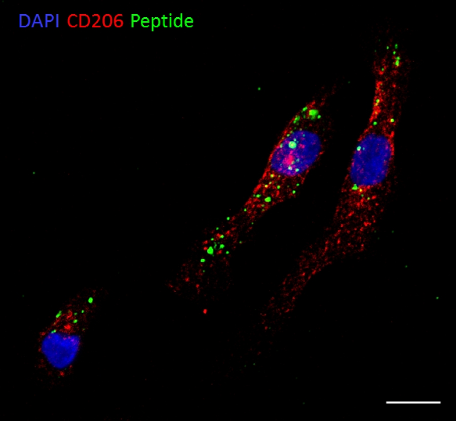 Polymersomes targeted with an M2 macrophage binding peptide (green) identified in our lab using phage display bind to and are taken up by M2s (red) originated from human primary monocytes. Scale bar 10µm. Authors: Anni Lepland, Pablo Scodeller, Lorena Simon Gracia